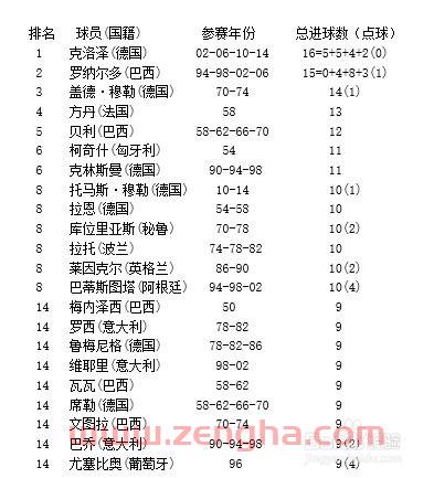 3、克洛泽(德国):16球。大罗(巴西):15球。盖德-穆勒(德国):14球。方丹(法国):13球。梅西(阿根廷):13球。姆巴佩(法国):12球。贝利(巴西):12球。科奇什(匈牙利):11球。